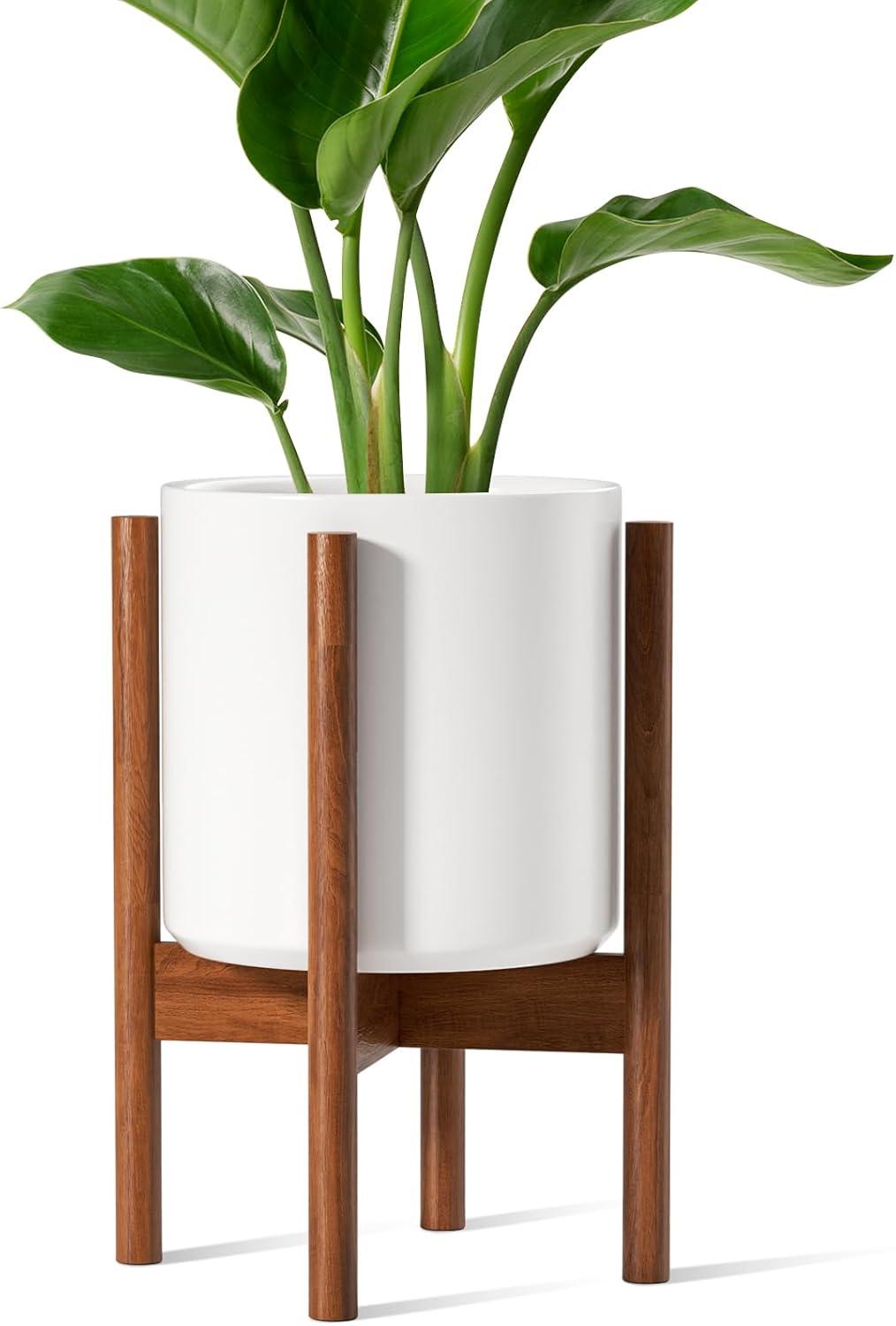 Complete Set for Plant Lovers: Designed with plant lovers in mind, this 12-inch ceramic planter comes paired with a sturdy, reversible acacia wood stand for that perfect blend of function and style. A drainage hole with a removable silicone plug keeps the watering mess-free, while soft foot pads protect your floors. The clean lines and warm wood tones bring a touch of mid-century modern charm to any room