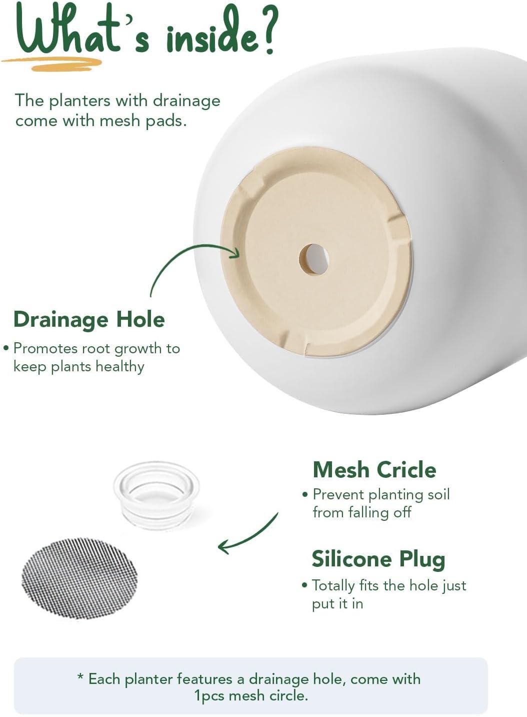 Drainage Hole & Accessories: Built-in drainage hole prevents waterlogging; includes rubber plug and mesh pad for flexible watering control and cleaner cachepot or direct-planting setups