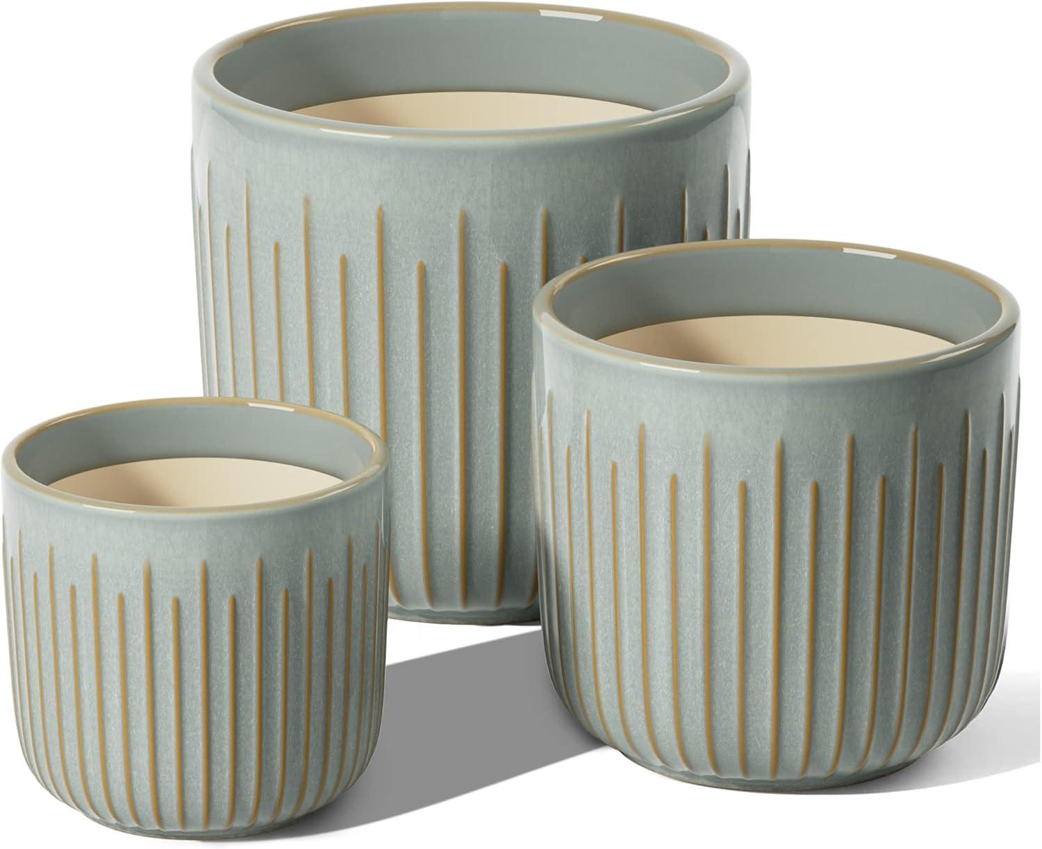 LE TAUCI Fluted Ceramic Planters Set of 3 – 8.3/7 / 5.7 in Star White Reactive Cylinder Indoor Plant Pots with Drainage Plug & Mesh, Glossy Stoneware Flower Pots for Succulents Herbs(Glaze Blue Gray)