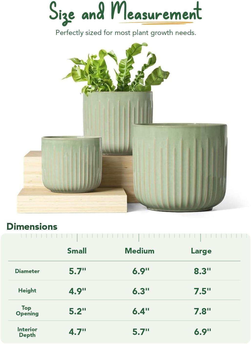 LE TAUCI Fluted Ceramic Planters Set of 3 – 8.3/7 / 5.7 in Star White Reactive Cylinder Indoor Plant Pots with Drainage Plug & Mesh, Glossy Stoneware Flower Pots for Succulents Herbs(Glaze Sage Green)