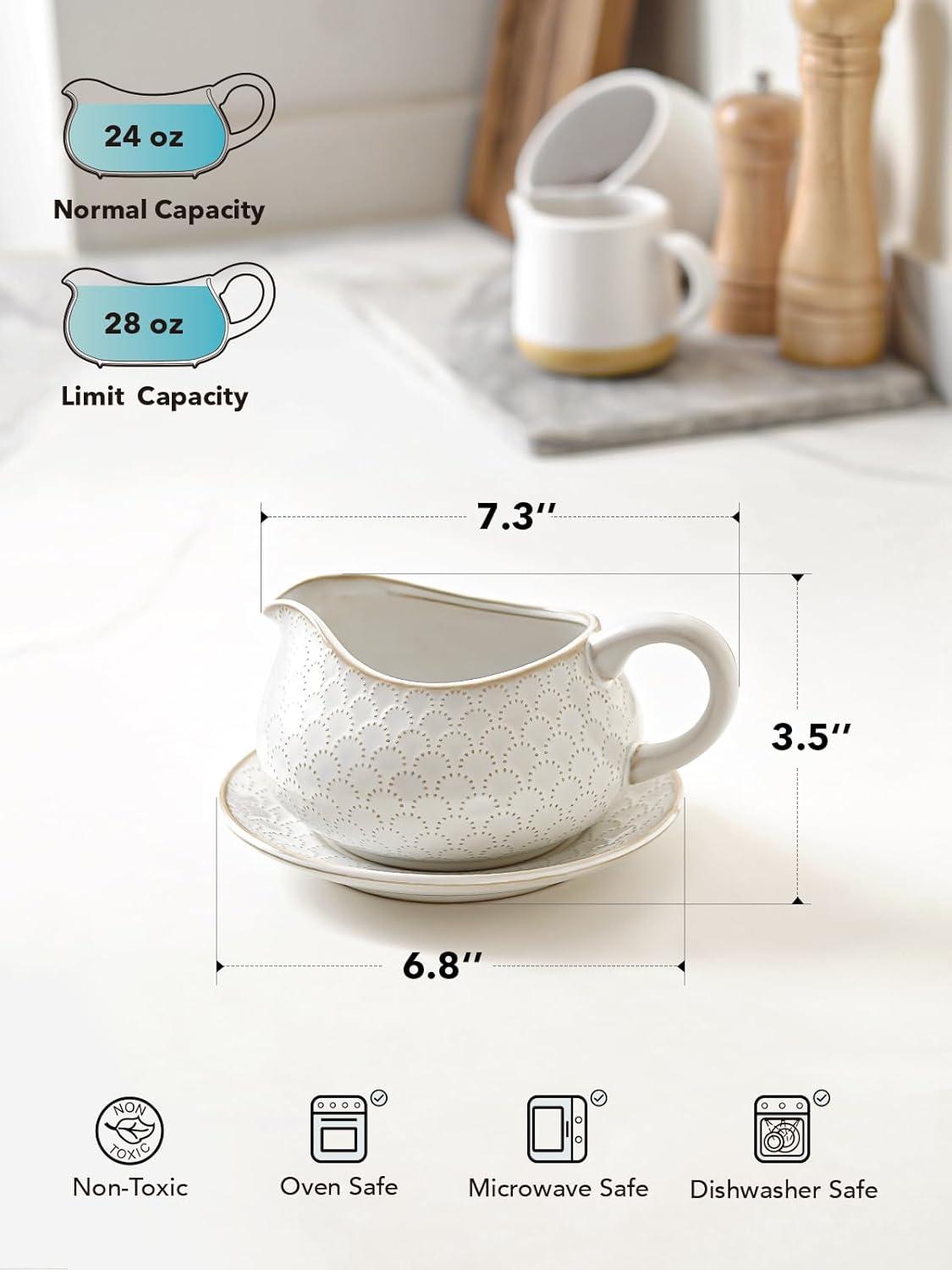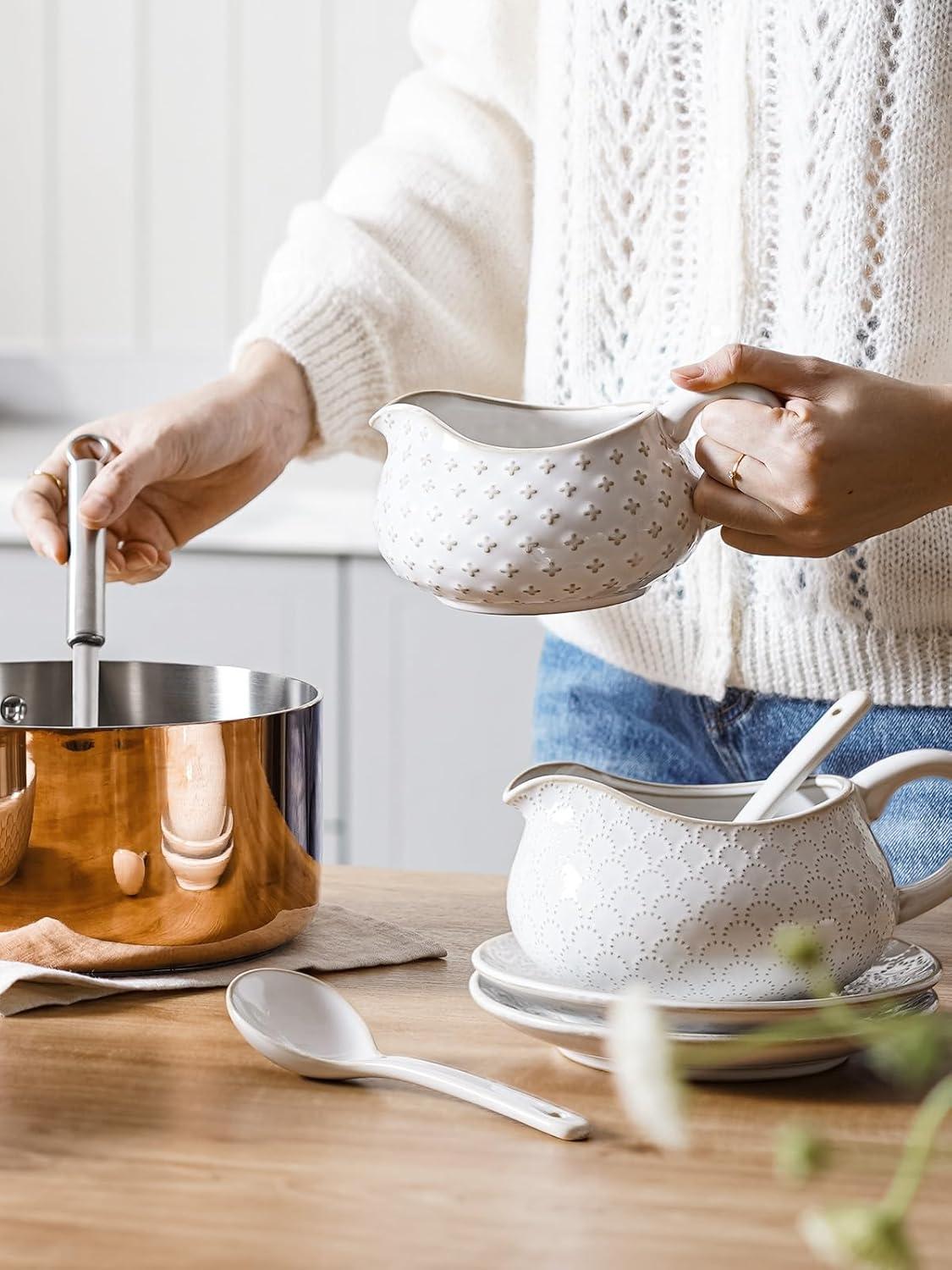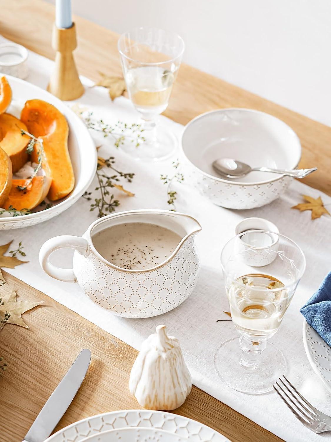 Cute Embossment: Featuring an arctic white glaze adorned with a charming embossed pattern, these farmhouse-style large gravy boats will infuse warmth and vitality into your home. Its cute and elegant design suits various styles, making it the pretty addition to your daily dinner or festival party