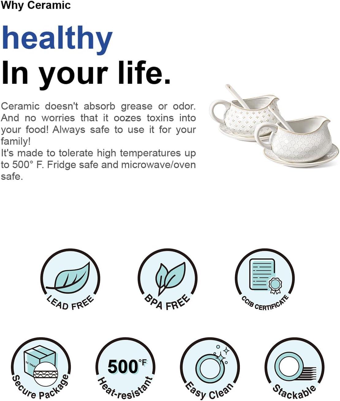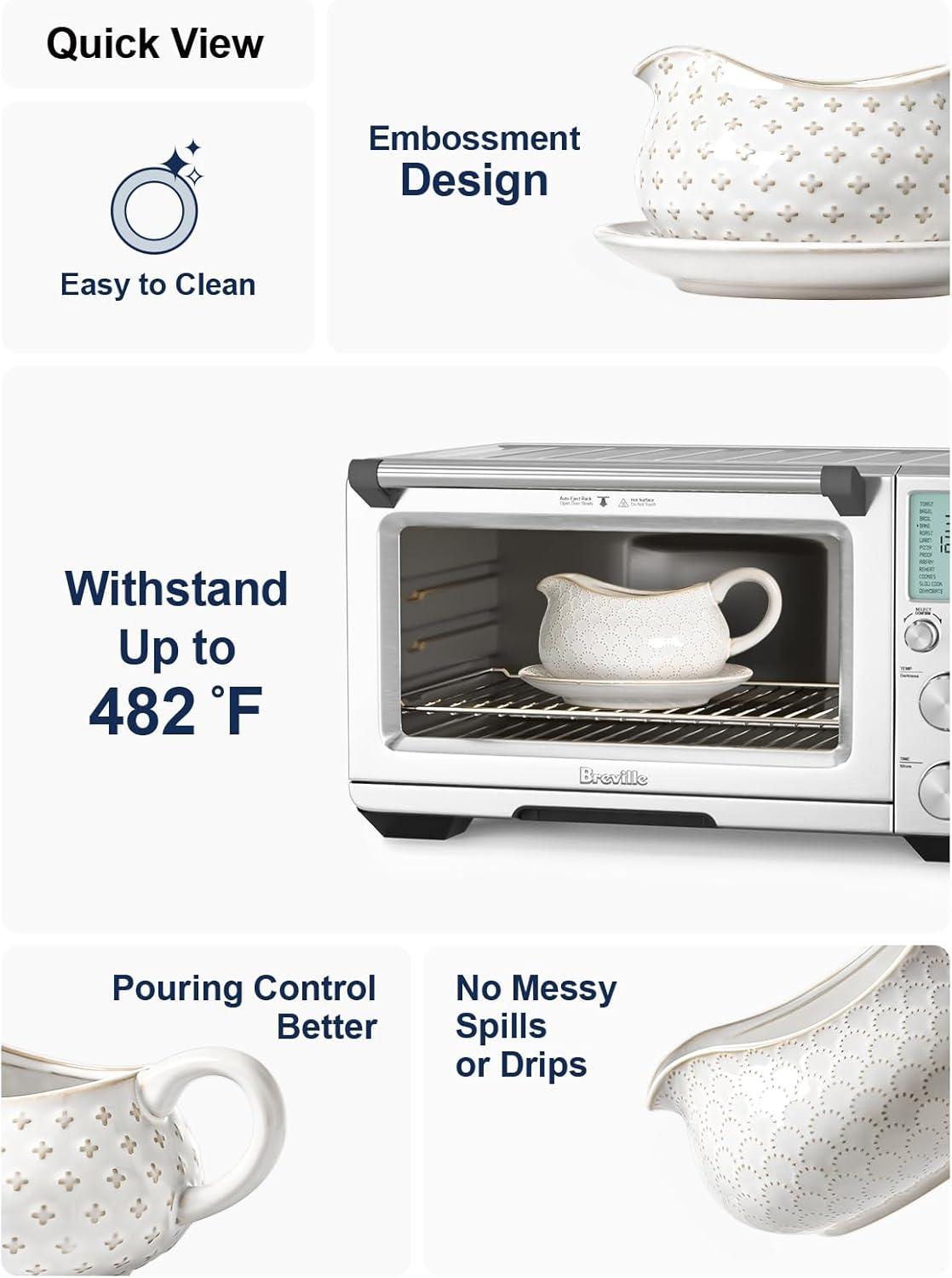 Heat-safe & Grade A Ceramic: Grade A ceramic to manufacture our gravy boat. Premium material, NO-LEAD and NO-CADMIUM, which will ideal to go into your freezer, microwave, and oven safe up to 482°F. They are resistant to cracks, stains, and scratches