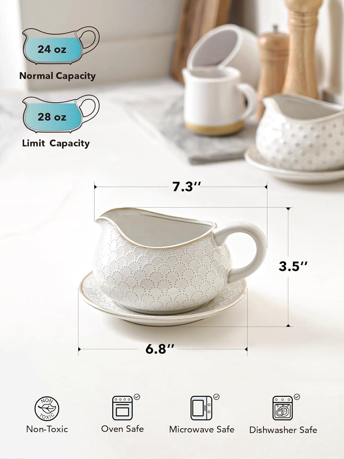Large Capacity: Unlike regular gravy boats, this one has a 24oz capacity(full capacity: 28oz) and is ideal for large family dinners or Thanksgiving party. You can place inside sauces, salad dressings, milk, broth, syrups, meat gravy, cheese dips and anything else that comes in mind. Large capacity, no more running to the kitchen over and over again to refill sauces
