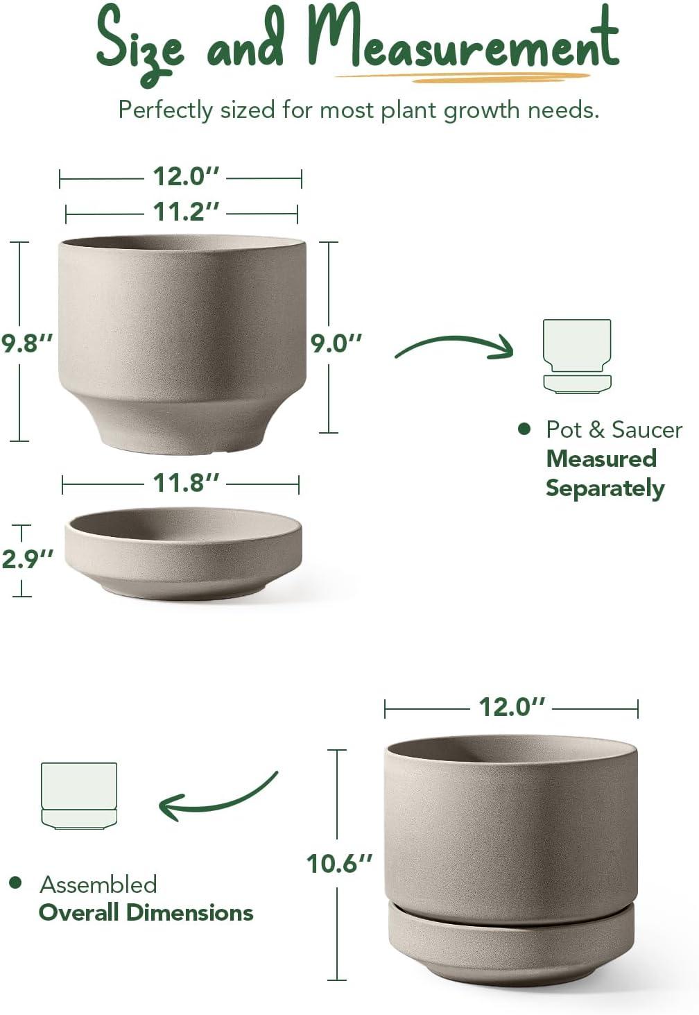 LE TAUCI Large 14 Inch Plant Pot with Saucer | Ceramic Outdoor & Indoor Big Planter Pot | Drainage Hole, Mesh Pad & Plug | Unglazed Porous | Modern Minimalist for Home and Patio – Neutral Gray(Neutral Gray)